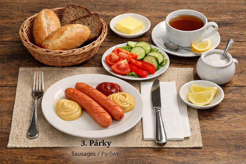 - Párky - horčica, (kečup), zelenina, maslo, pečivo, čaj, cukor, citrón