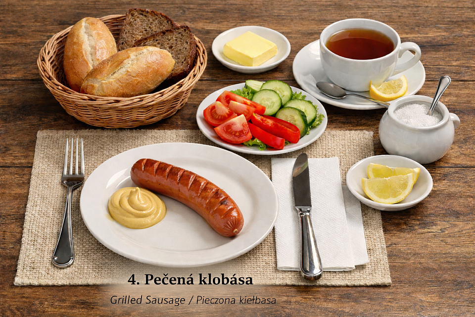 - Pečená klobása - horčica, zelenina, maslo, pečivo, čaj, cukor, citrón