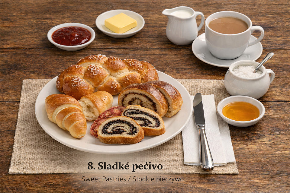 - Sladké pečivo - podľa dennej ponuky - (vianočka , lúpačky, makovník, orechovník), maslo, džem, (med), mlieko, (biela káva, kakao), cukor,